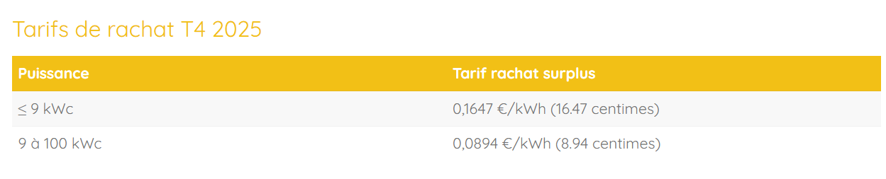 Avec un tarif de rachat à 4 centimes/kWh et un prix d'achat de l'électricité à environ 25 centimes/kWh, il est 6 fois plus rentable de consommer votre production que de la revendre. C'est pourquoi nous recommandons l'autoconsommation maximale, avec une batterie physique ou virtuelle si besoin.