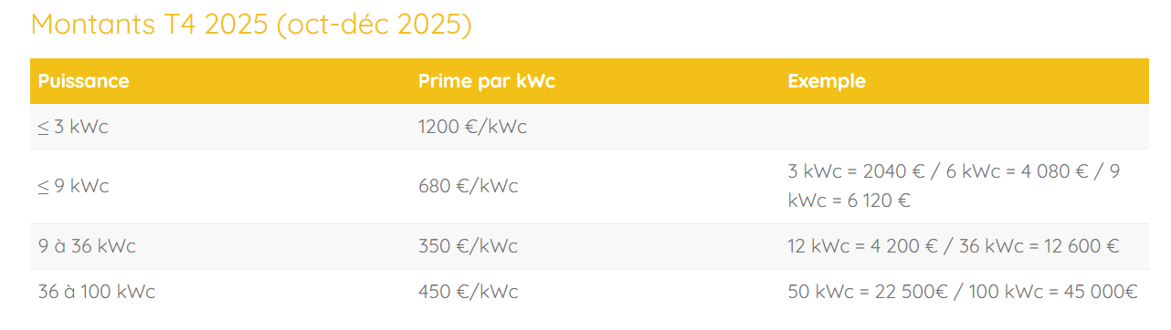 - ≤ 9 kWc : versement unique à la 1ère facture (environ 1 an après mise en service)