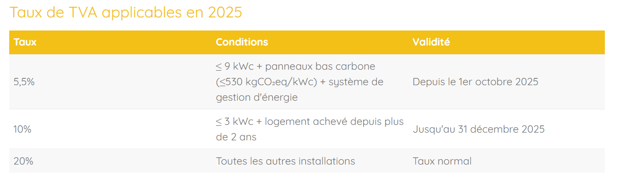 - Pas de batterie : si batterie incluse, toute l'installation passe à TVA 20%